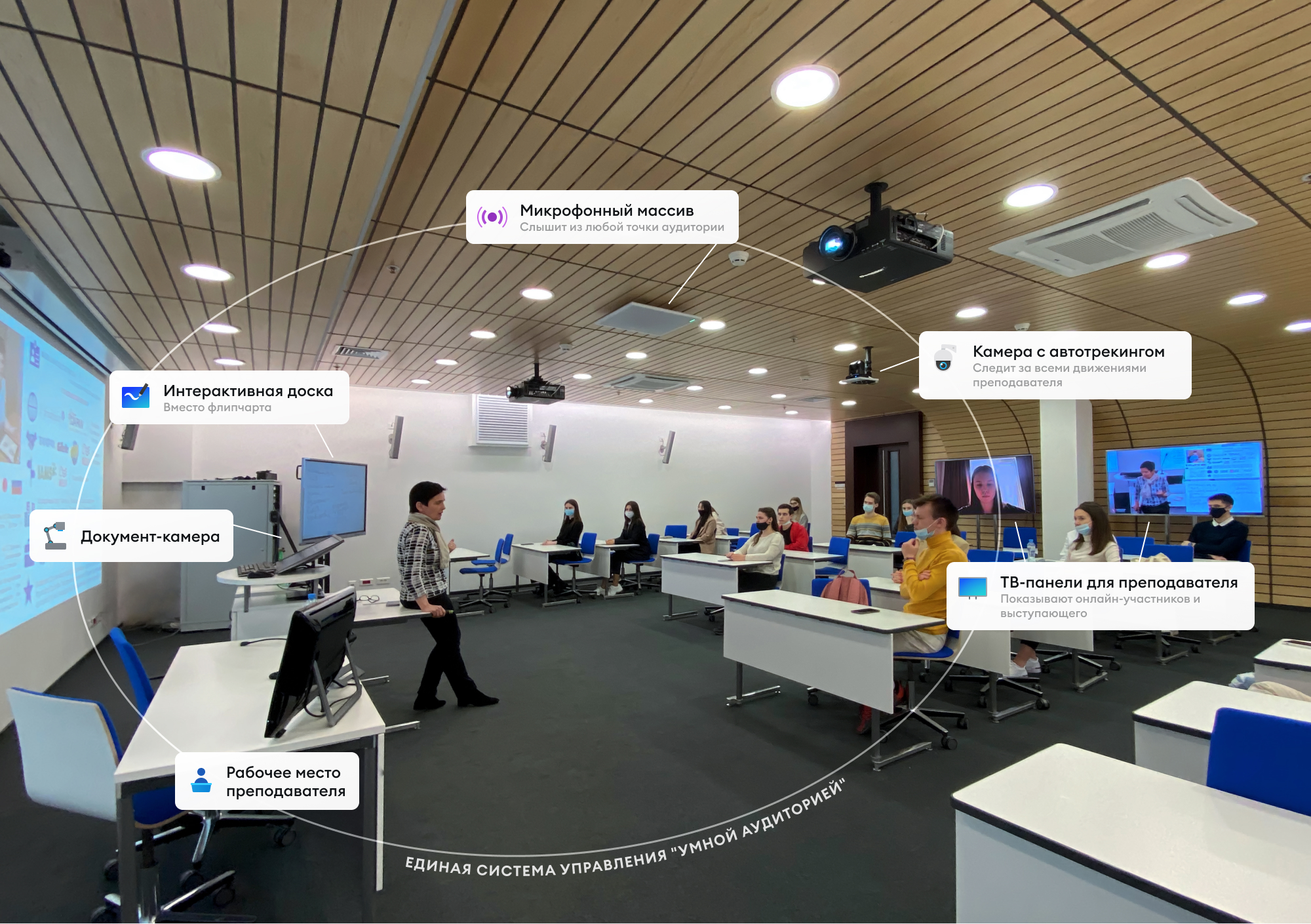- Качественное изображение. Камера с автотрекингом следит за перемещением преподавателя, а камера общего вида транслирует изображение аудитории, позволяя студентам, подключённым дистанционно, видеть всех участников занятия. Для отображения онлайн-студентов используется система экранов в передней и задней части аудитории. Таким образом студенты в классе могут видеть и общаться со своими сокурсниками на дистанте, а преподаватель — поддерживать с ними зрительный контакт.